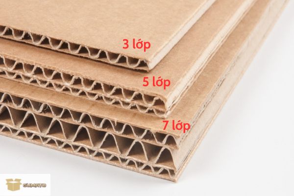 Thùng carton thường được sản xuất từ 3-7 lớp giấy, trong đó loại 5 lớp giấy là phổ biến nhất cho các sản phẩm đóng gói thông thường. Số lớp giấy sẽ quyết định đến độ cứng của thùng, khả năng chịu lực cũng như giá thành. Ví dụ: