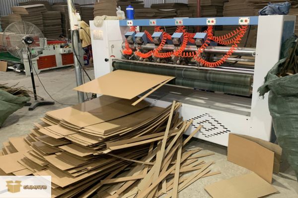 Sau khi đã chuẩn bị đầy đủ nguyên liệu giấy cùng quy cách thùng, quá trình tiếp theo là cắt giấy thành những mảnh theo số lượng và kích thước đã được tính toán.