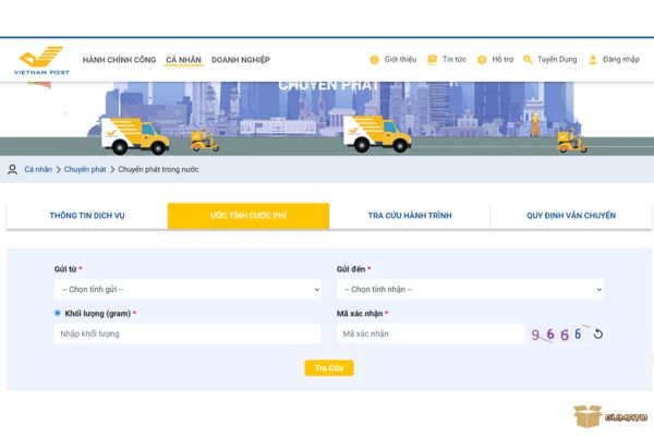 Sau khi truy cập trang web theo link ở trên, bạn điền đầy đủ thông tin về hàng hóa gửi từ đâu và đến đâu, khối lượng (theo đơn vị gram), và điền mã xác nhận theo hình.